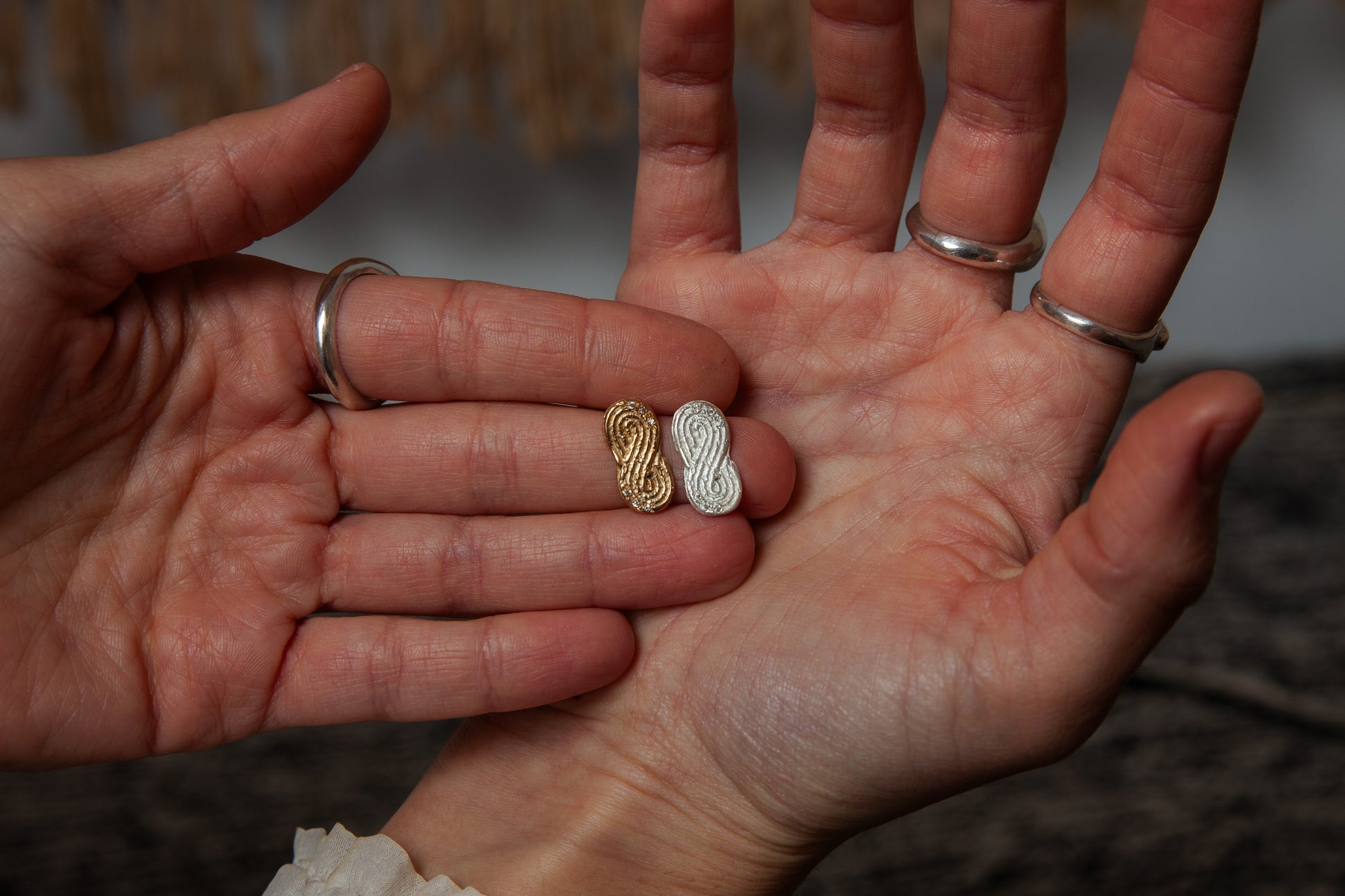 Noor Earrings Infinity-shaped earrings With a special handmade texture Unique earrings with inlays of white zircons or white diamonds that give a special shade to the earring The gold-plated version should be prevented from contact with water and various chemicals